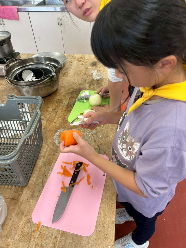 夕方には野外炊飯を予定していましたが、大雨のため屋内での夕食づくりに変更しました。